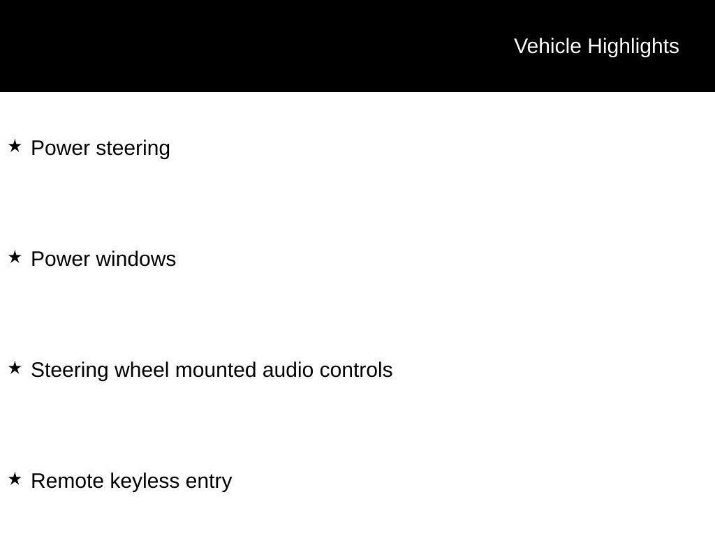 - Radio w/Seek-Scan, Clock, Aux Audio Input Jack, Steering Wheel Controls and External Memory Control