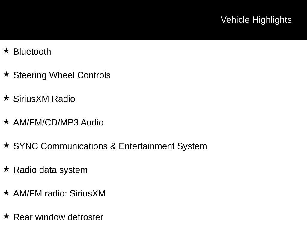 - Radio w/Seek-Scan, Clock, Steering Wheel Controls, Radio Data System and SYNC 3 External Memory Control