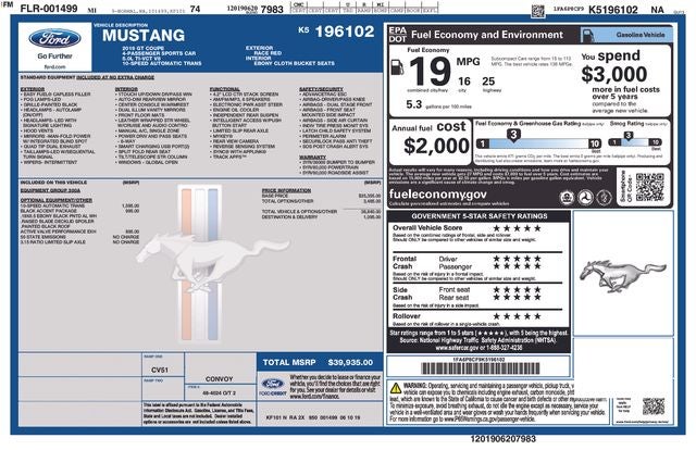 Beyond its heart-pounding performance, the Mustang GT offers a wealth of premium features that elevate the driving experience. Indulge in the power-adjustable driver's seat, steering wheel-mounted audio controls, and the advanced SYNC infotainment system. Enjoy the added style and presence of the Black Accent Package, which includes a bold black decklid spoiler, blacked-out badges, and striking 19-inch ebony-painted aluminum wheels.