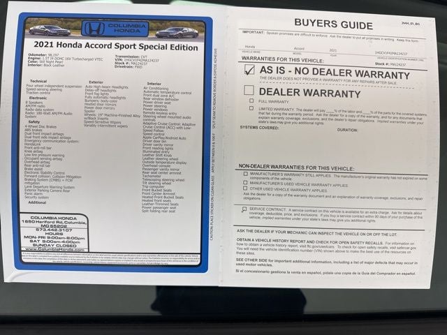 2021 Honda Accord Sport Special Edition FWD CVT 1.5T I4 DOHC 16V Turbocharged VTEC 29/35 City/Highway MPG
