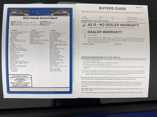 2022 Honda Accord Sport FWD CVT 1.5T I4 DOHC 16V Turbocharged VTEC 29/35 City/Highway MPG
