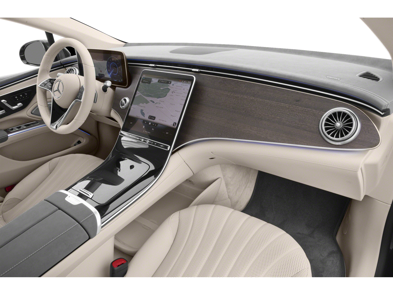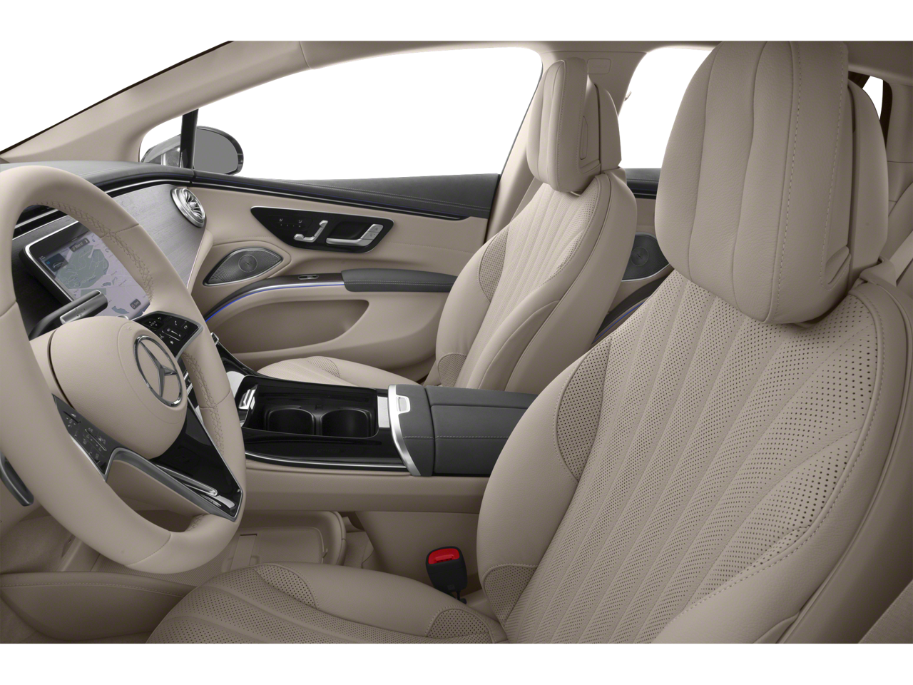 Inside the cabin, the EQS offers a truly luxurious environment with premium materials and thoughtful design throughout. Leather seating surfaces, genuine wood trim accents on the dashboard and door panels, and meticulous craftsmanship create a refined atmosphere for both driver and passengers. The multi contour front seats with massage feature provide exceptional comfort on long drives, while both heated and ventilated front seats ensure year round comfort in any weather. The memory seating system, steering wheel memory, and power adjustable head restraints allow each driver to easily personalize their seating position.