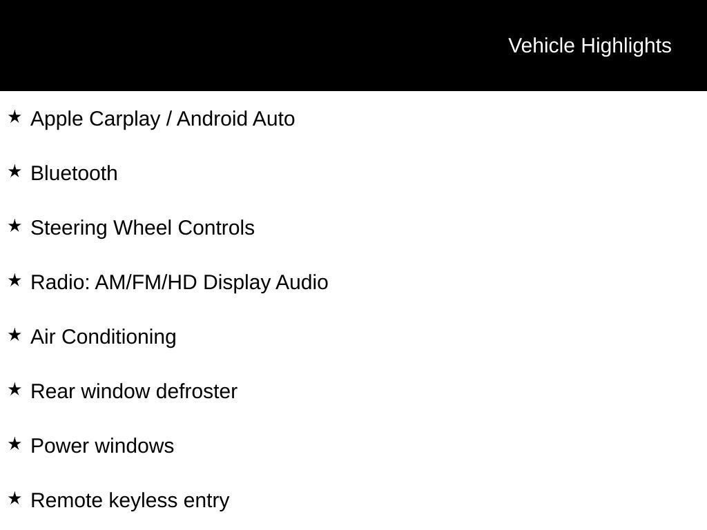 - Radio: AM/FM/HD Display Audio -inc: 8" touchscreen, wireless Android Auto, Apple CarPlay, 4 speakers, USB connectivity, steering wheel audio controls and Bluetooth® hands-free phone system w/voice recognition
