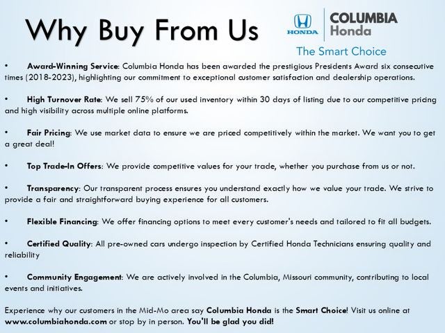 Experience why our customers in the Mid-Mo area say Columbia Honda is the Smart Choice! Visit us online at www.columbiahonda.com or stop by in person. You'll be glad you did!