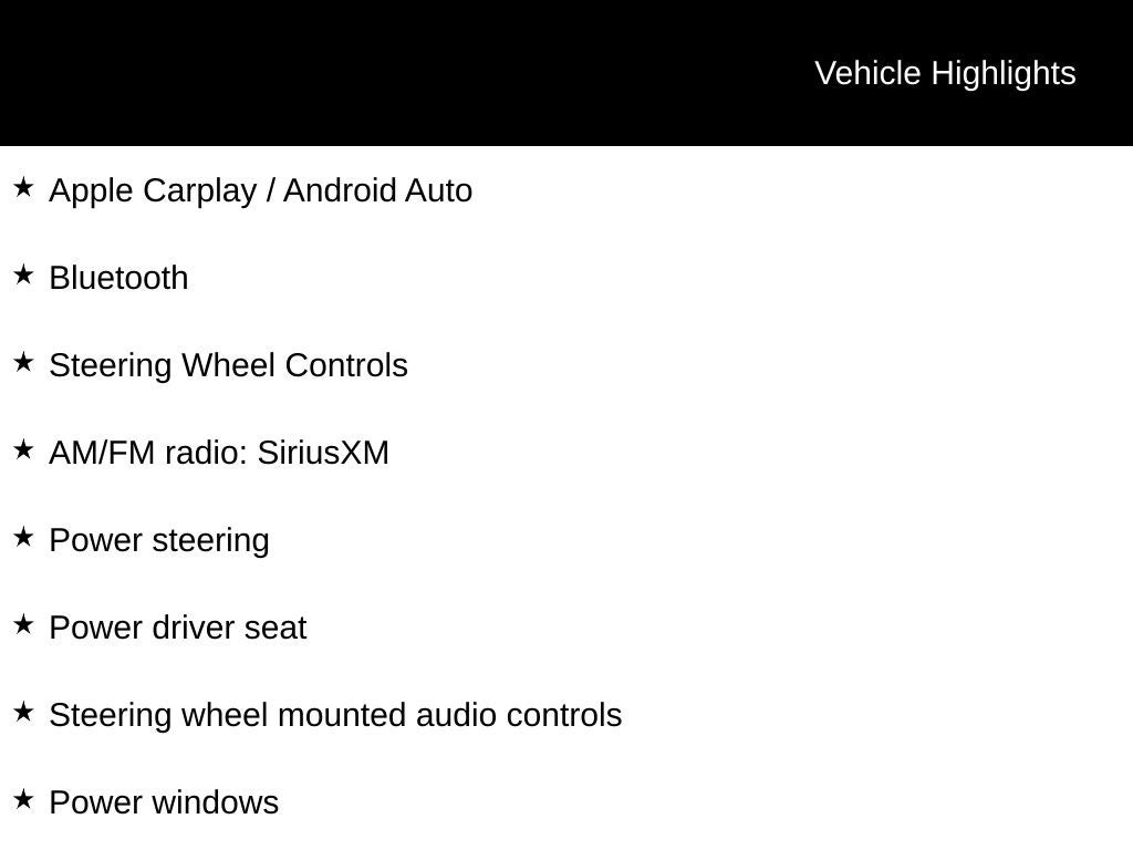 - Radio: SXM/AM/FM/AUX/USB Audio System -inc: 6 speakers, 8.0" color touch-screen display, Apple CarPlay, Android Auto, Bluetooth® hands-free phone system and streaming (audio or text message), voice recognition for audio features, Siri Eyes Free, SiriusXM radio w/advanced audio features, 1 USB-A and 1 USB-C front ports and steering wheel audio controls