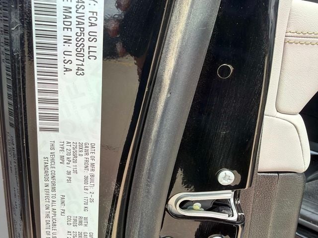 10 Speakers, 2nd Row Manual Window Shades, 3rd row seats: bench, 4-Wheel Disc Brakes, ABS brakes, Air Conditioning, Alloy wheels, AM/FM radio: SiriusXM with 360L, Anti-whiplash front head restraints, Apple CarPlay/Android Auto, Audio memory, Auto Adjust In Reverse Exterior Mirrors, Auto High Beam Headlamp Control, Auto Power Folding Exterior Mirrors, Auto Power-Folding Mirrors, Auto-Dimming Exterior Driver Mirror, Auto-dimming Rear-View mirror, Auto-leveling suspension, Automatic temperature control, Compass, Convenience Group I, Delay-off headlights, Driver door bin, Driver vanity mirror, Driver's Seat Mounted Armrest, Dual front impact airbags, Dual front side impact airbags, Emergency communication system: Jeep Connect, Exterior Mirrors Approach Lamps, Exterior Mirrors w/Memory, Exterior Mirrors w/Supplemental Signals, Four wheel independent suspension, Front anti-roll bar, Front Bucket Seats, Front Center Armrest w/Storage, Front dual zone A/C, Front fog lights, Front reading lights, Fully automatic headlights, Garage door transmitter, Heated door mirrors, Heated Exterior Mirrors, Heated front seats, Heated Second Row Seats, Heated steering wheel, Illuminated entry, Knee airbag, Leather Trimmed Bucket Seats, Low tire pressure warning, Memory seat, Navigation System, Normal Duty Suspension, Occupant sensing airbag, Outside temperature display, Overhead airbag, Overhead console, P&P Park & Unpark Assist w/Stop System, Passenger door bin, Passenger seat mounted armrest, Passenger vanity mirror, Power adjustable front head restraints, Power door mirrors, Power driver seat, Power passenger seat, Power steering, Power windows, Quick Order Package 25E, Radio data system, Radio: Uconnect 5 Nav w/10.1 Display, Rain Sensitive Windshield Wipers, Rear air conditioning, Rear anti-roll bar, Rear dual zone A/C, Rear reading lights, Rear seat center armrest, Rear window defroster, Reclining 3rd row seat, Remote keyless entry, Side Distance Warning, Speed-sensing steering, Split folding rear seat, Steering wheel memory, Steering wheel mounted audio controls, Surround View Camera System, Telescoping steering wheel, Tilt steering wheel, Traction control, Turn signal indicator mirrors, Ventilated front seats.