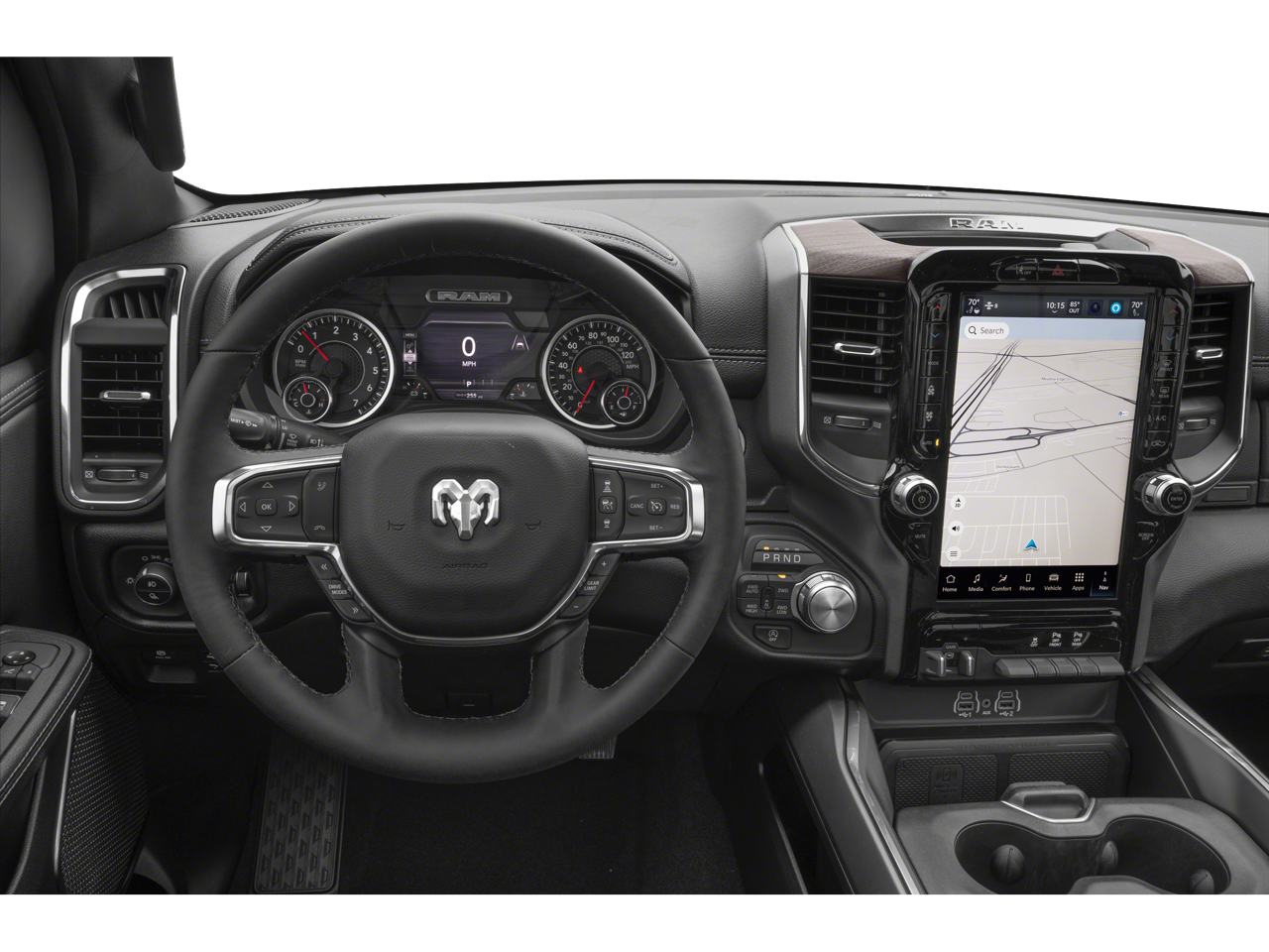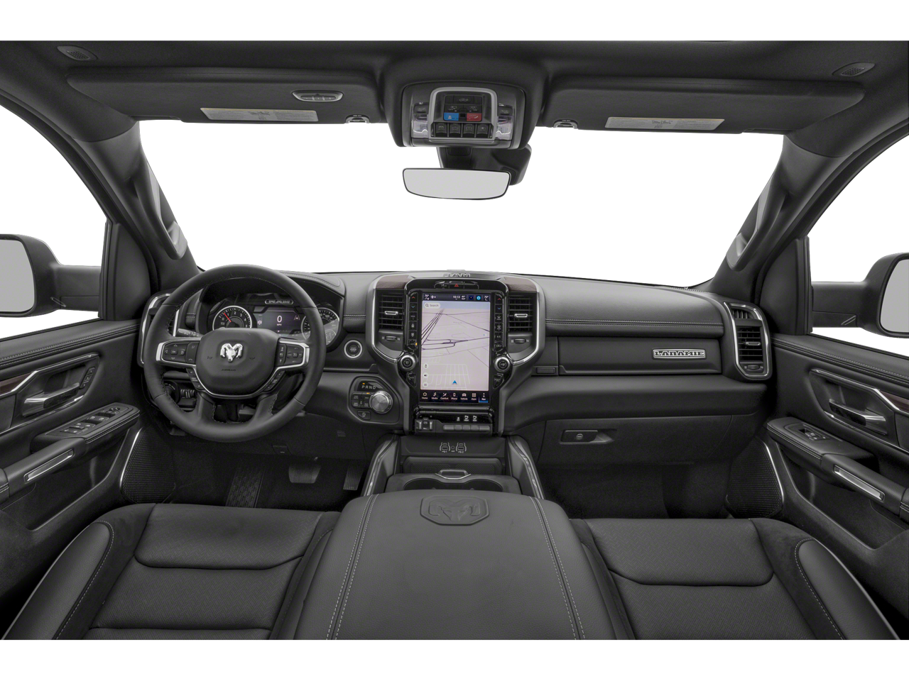 10 Speakers, 33 Gallon Fuel Tank, 4G LTE Wi-Fi Hot Spot, Accent Color Door Handles, Accent Color Premium Power Mirrors, Accent Color Tailgate Handle, Active Noise Control System, Adjustable pedals, Air Conditioning, AM/FM radio: SiriusXM with 360L, Anti-Spin Differential Rear Axle, Apple CarPlay/Android Auto, Audio memory, Auto High-beam Headlights, Auto Power-Folding Mirrors, Auto-Dimming Exterior Driver Mirror, Auto-dimming Rear-View mirror, Automatic temperature control, Bed Utility Group, Black Exterior Truck Badging, Black Headlamp Bezels, Black Interior Accents, Black Painted Exterior Mirrors Caps, Black Tail Lamp Bezels, Body Color Front Bumper, Body Color Rear Bumper with Step Pads, Bright Day Light Opening Moldings, Chrome Appearance Group, Compass, Convex Wide-Angle Exterior Mirror Insert, Delay-off headlights, Dual Exhaust with Black Tips, Exterior 115V AC Outlet, Exterior Mirrors Approach Lamps, Exterior Mirrors Courtesy Lamps, Exterior Mirrors with Heating Element, Exterior Mirrors with Memory, Exterior Mirrors with Supplemental Signals, Front Bucket Seats, Front dual zone A/C, Front fog lights, Fully automatic headlights, Garage door transmitter, GPS Navigation, Grille Surround 3 Black Texture 2 Black, Heated door mirrors, Heated front seats, Heated rear seats, Heated steering wheel, Integrated Voice Command with Bluetooth®, Laramie Level 1 Equipment Group, Leather steering wheel, Leather Trimmed Bucket Seats, Memory seat, MOPAR 4 Adjustable Cargo Tie-Down Hooks, MOPAR Spray in Bedliner, Navigation System, Night Edition, Off-Road Information Pages, ParkView Rear Back-Up Camera, Pedal memory, Power door mirrors, Power driver seat, Power passenger seat, Power steering, Power windows, Proximity Approach/Departure Lamps, Quick Order Package 27H Laramie, Radio: Uconnect 5 Navigation with 12.0 Display, Rain Sensitive Windshield Wipers, RAM Grille Badge - Black, Remote keyless entry, Remote Tailgate Release, SiriusXM with 360L, Speed control, Split folding rear seat, Sport Performance Hood, Steering wheel mounted audio controls, Telescoping steering wheel, Tilt steering wheel, Traction control, Ventilated front seats, Wheel to Wheel Side Steps, Wheels: 22 x 9 Forged Aluminum.